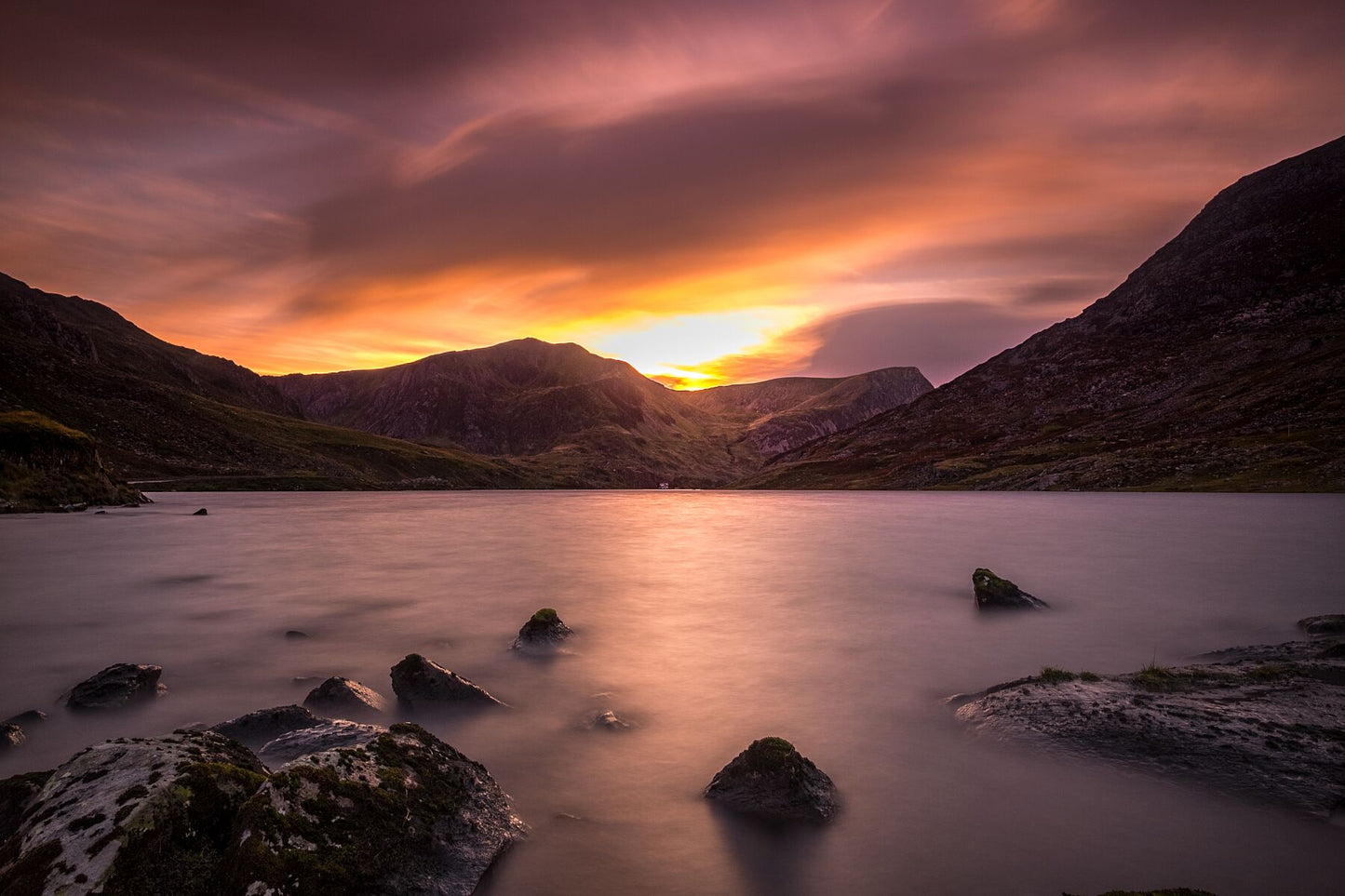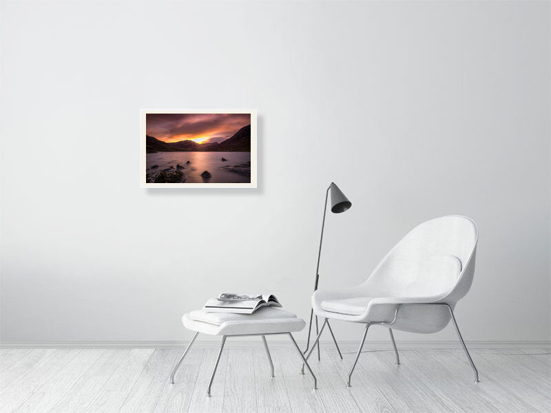 This captivating photograph of Capel Curig, located in the heart of Snowdonia National Park, Wales, perfectly encapsulates the region's dramatic landscape and serene beauty. Capel Curig is known for its stunning vistas, with rugged mountains and tranquil lakes providing a picturesque setting. The image captures a mesmerising sunset over the water, where the vibrant colours of the sky reflect off the smooth surface of the lake, creating a mirror-like effect. The long exposure enhances the tranquil atmosphere, while the rocky foreground adds texture and depth, leading the eye towards the imposing mountain peaks in the background.