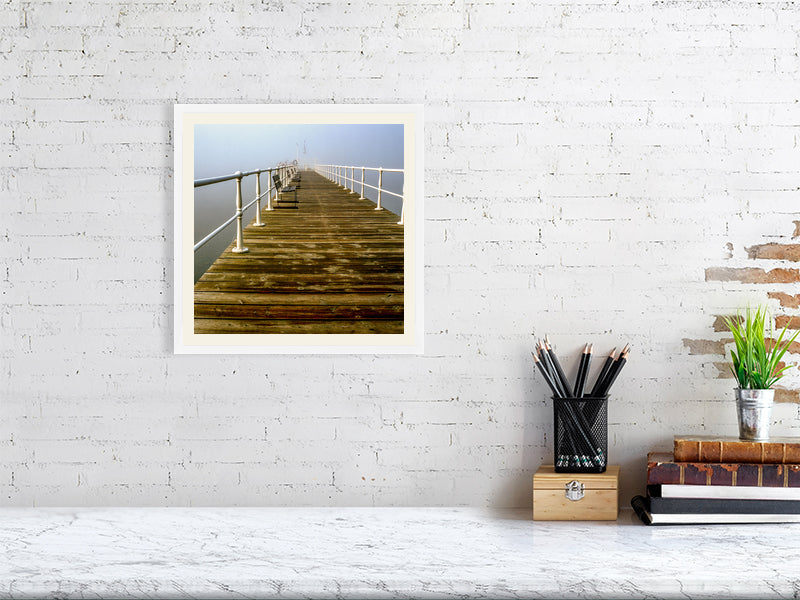 This evocative photograph of the pier on Lake Ullswater in the Lake District beautifully captures the tranquil atmosphere of a misty morning. The long, weathered wooden pier stretches out into the calm waters, gradually disappearing into the thick fog that shrouds the lake. The white railings and empty benches add a sense of solitude and quiet anticipation, inviting viewers to imagine the stillness and serenity of the scene.